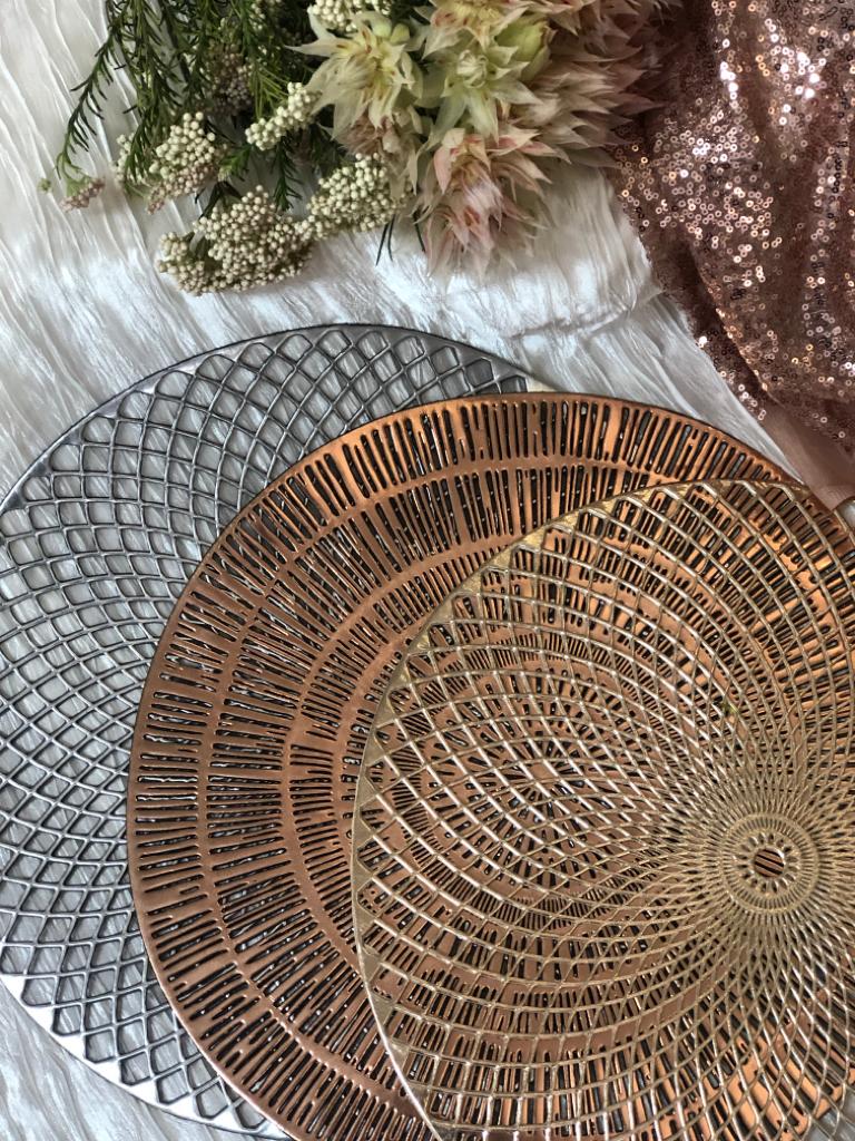 Underplates White underplates Black and gold underplates Black and silver underplates Gold or silver underplates Rose gold underplates Champagne coloured underlates Rustic underplates